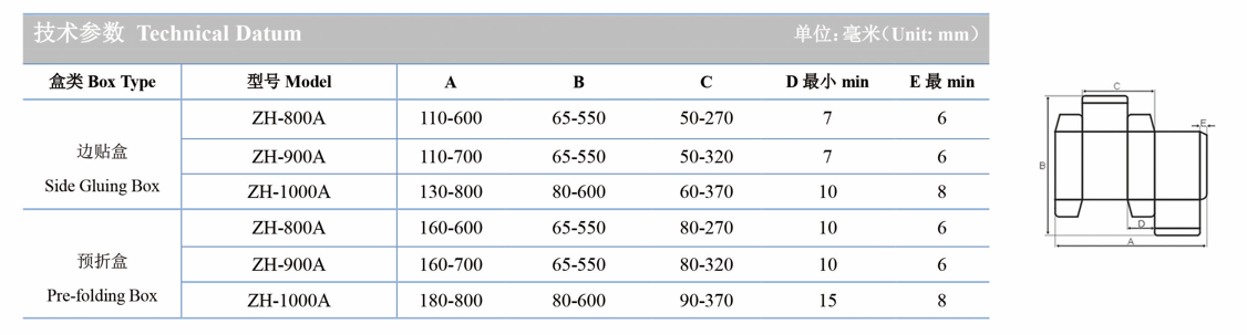 ZH-A is a series of pre-folding folder gluer . Usage of paper is 210-700gsm carton paper and N/F/E corrugated boxes. The box can be easily open with pre-folding function. It’s suitable for automatic packing machine. We also offer smaller and bigger size of this kind of machine.